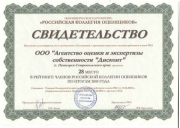 2002Пройдена аккредитация в РАО «ЕЭС России» на проведение работ по определению рыночной стоимости объектов, принадлежащих предприятиям электроэнергетики.2001Агентство «Дисконт» прошло аккредитацию в РАО «ЕЭС России» на право проведения переоценки основных средств предприятий электроэнергетики по состоянию на 01.01.2002 года.В апреле 2001 года заключены Соглашения с Министерством имущественных отношений Ставропольского края о взаимодействии при выполнении работ по определению рыночной стоимости и иной стоимости государственного имущества по следующим направлениям оценки: